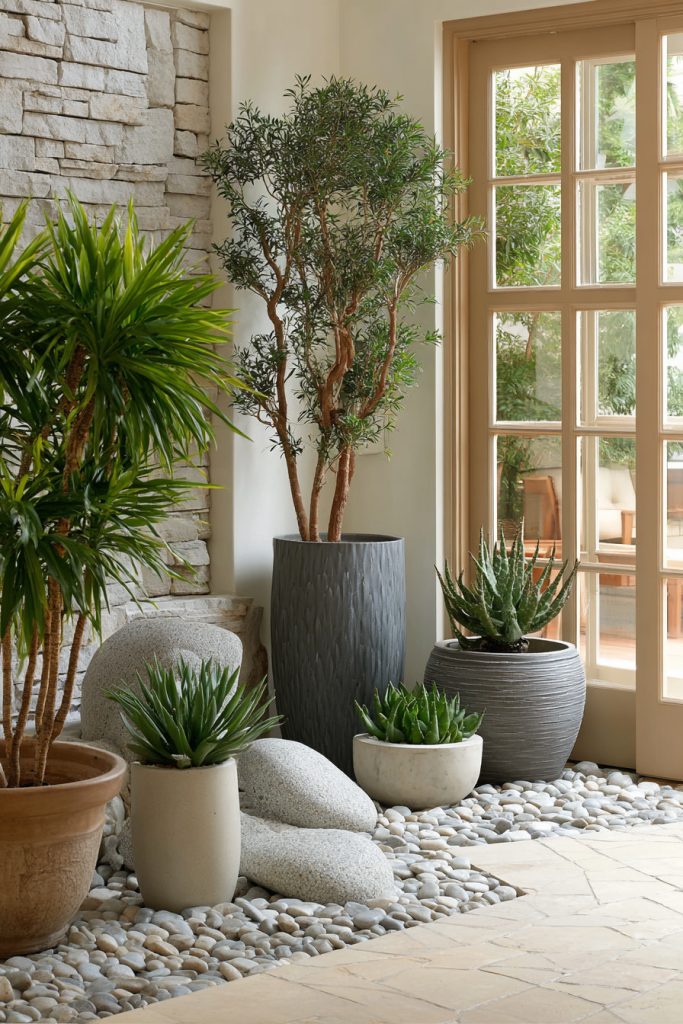 You can create a calm, natural look by mixing dry moss with small rocks. The moss adds soft texture, and the rocks bring structure to your indoor garden.