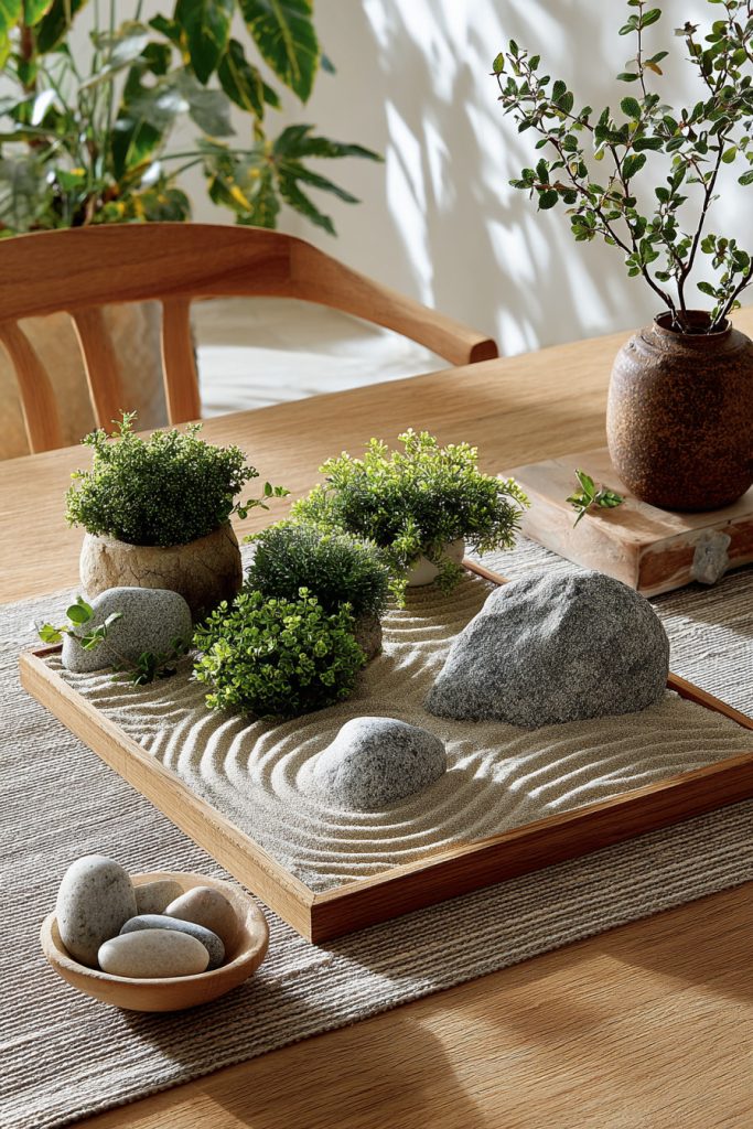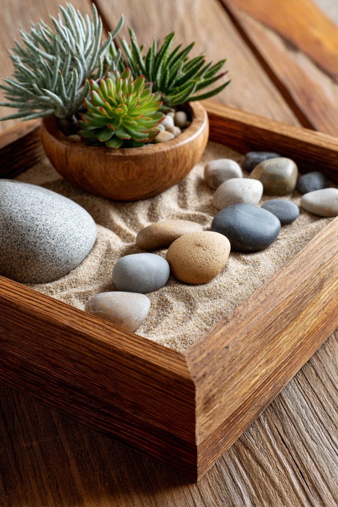 You can create a small indoor zen garden using sand and smooth pebbles. Choose a shallow wooden or ceramic tray to hold the materials. Rake patterns in the sand for a calming effect that you can change whenever you like.
