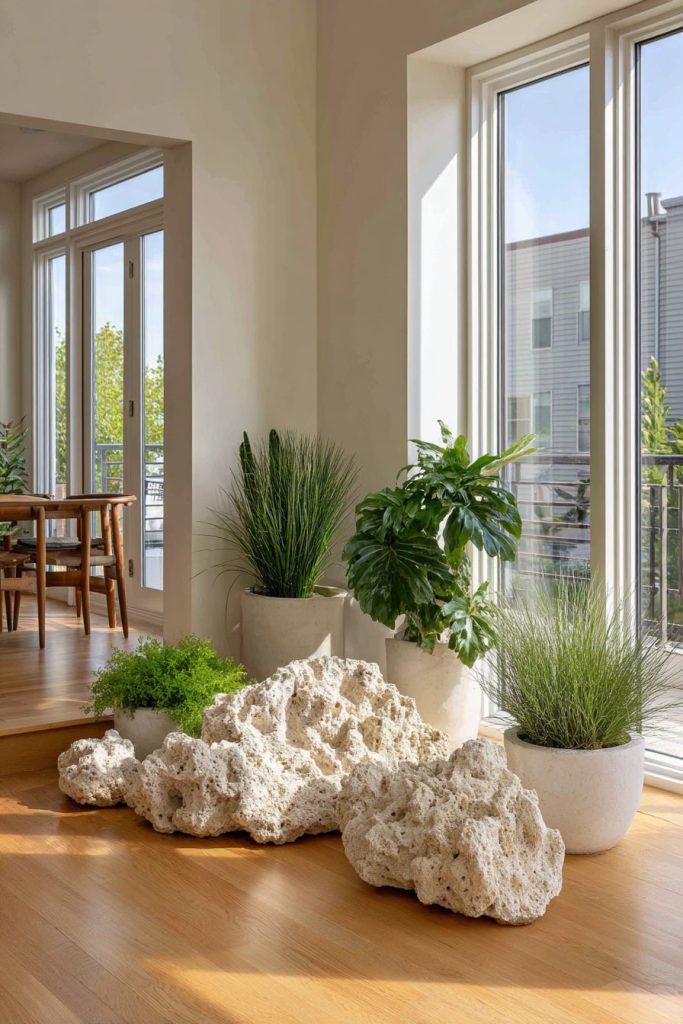 You can add coral rock accents to bring a natural, bright look to your small indoor garden. These rocks pair well with drought-resistant grasses that need little water and care.