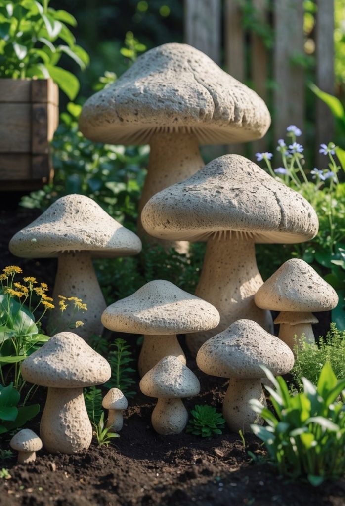 You can make charming mushroom sculptures using hypertufa that add a rustic touch to your garden. These lightweight sculptures are easy to shape and look great in shaded spots. Over time, your mushrooms will gain a natural, weathered look that fits perfectly with moss and plants around them. They are a fun way to bring personality to your outdoor space.