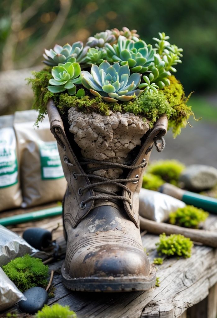 You can turn an old boot into a unique hypertufa planter. Start by mixing your hypertufa and carefully filling the boot, shaping it to hold soil.