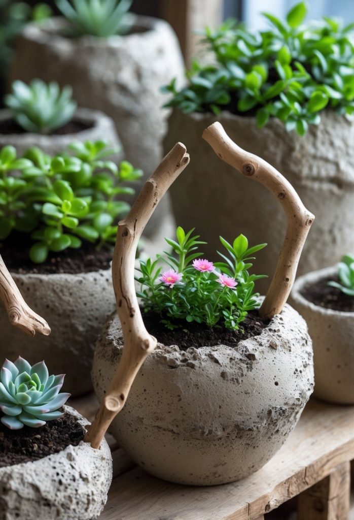 You can add a rustic touch to your hypertufa planters by using natural branches as handles. Just find some sturdy branches and attach them carefully to the sides of your planter.
