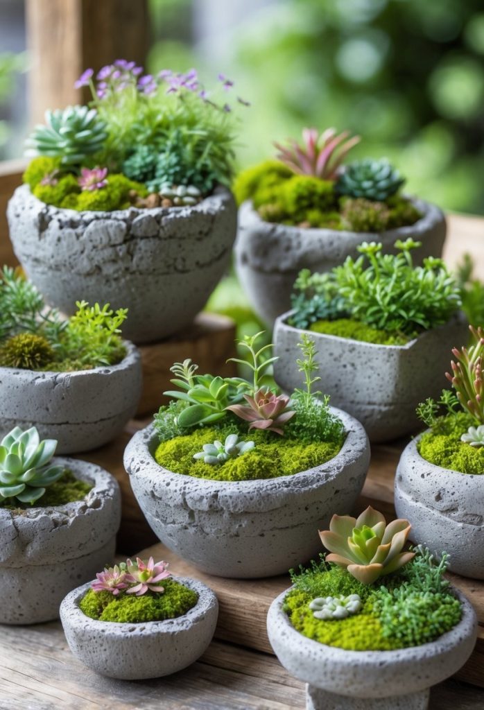 You can use hypertufa to make charming containers for fairy gardens. These small planters have a rustic look that fits well with tiny plants and decorations.
