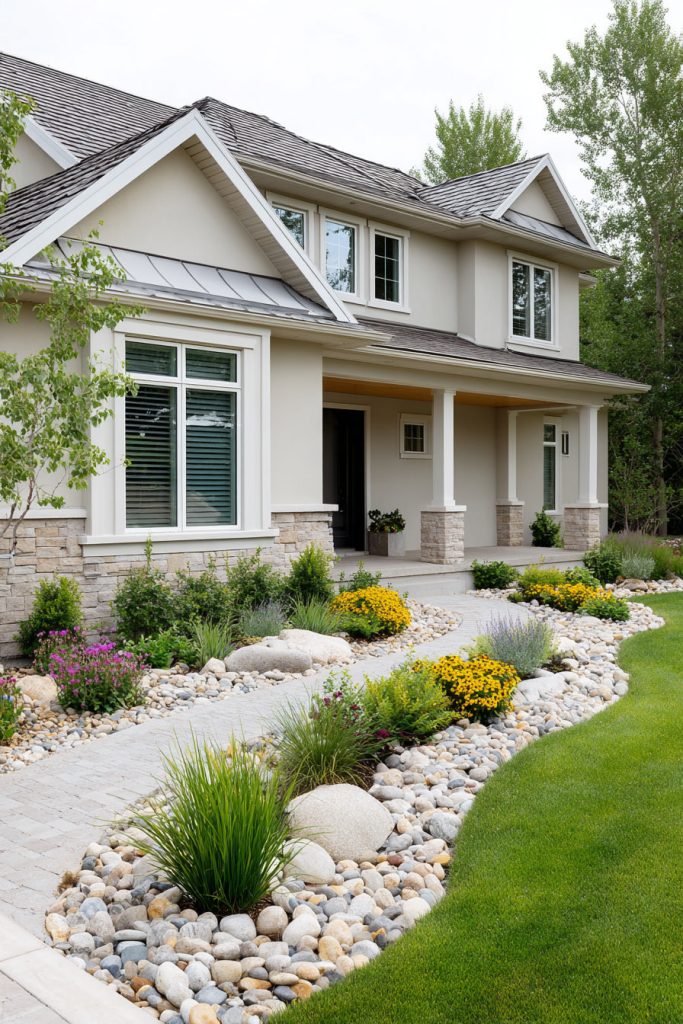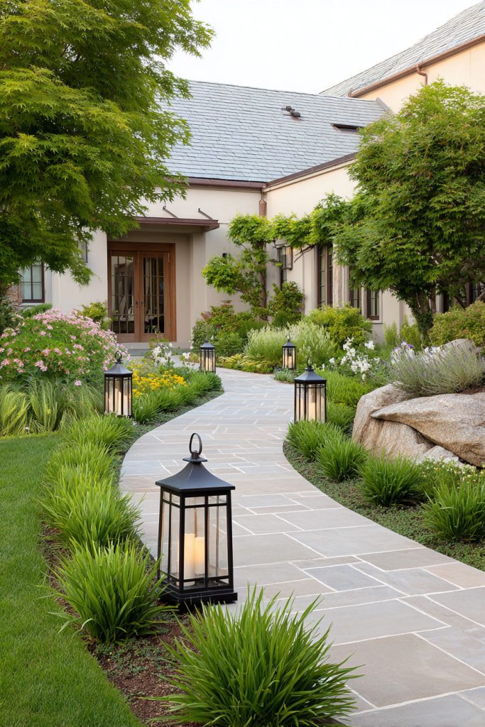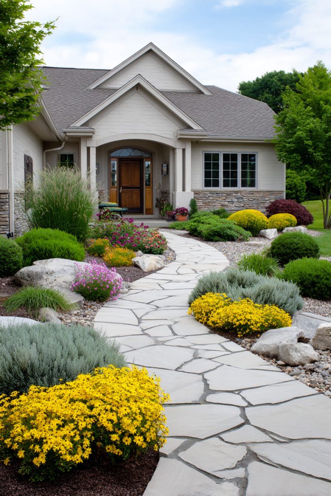 You can create a friendly feel with a curved stone pathway leading to your front door. The gentle curve adds interest and guides guests slowly, making the entrance inviting.