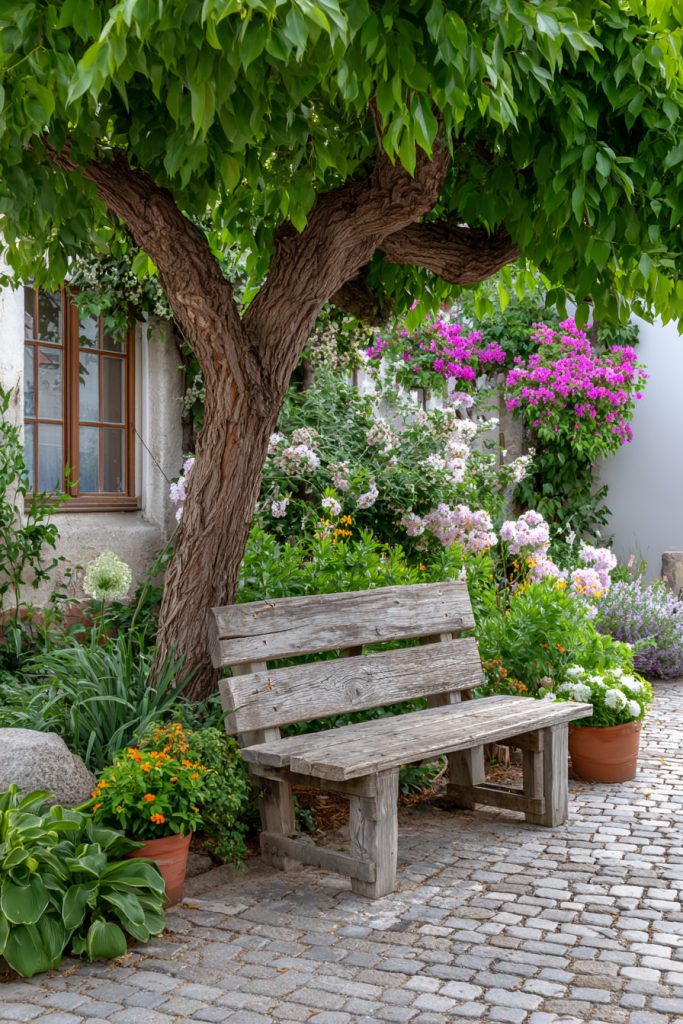 You can create a calm spot by placing a rustic wooden bench under a flowering tree. The natural wood looks great with colorful blooms and green leaves.
