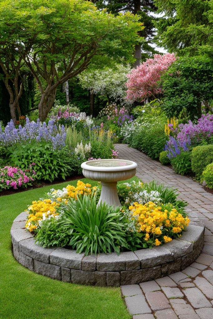 You can create a simple and pretty look with a round garden bed. Place a birdbath in the center to attract birds and add life to your yard. Surround it with colorful flowers or small shrubs to make the birdbath stand out.