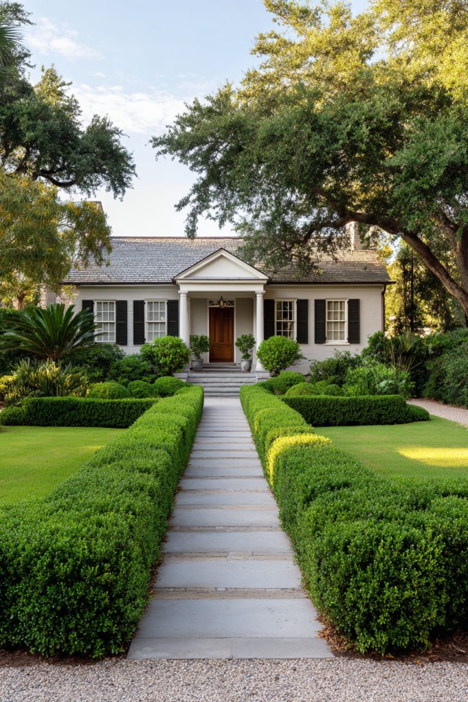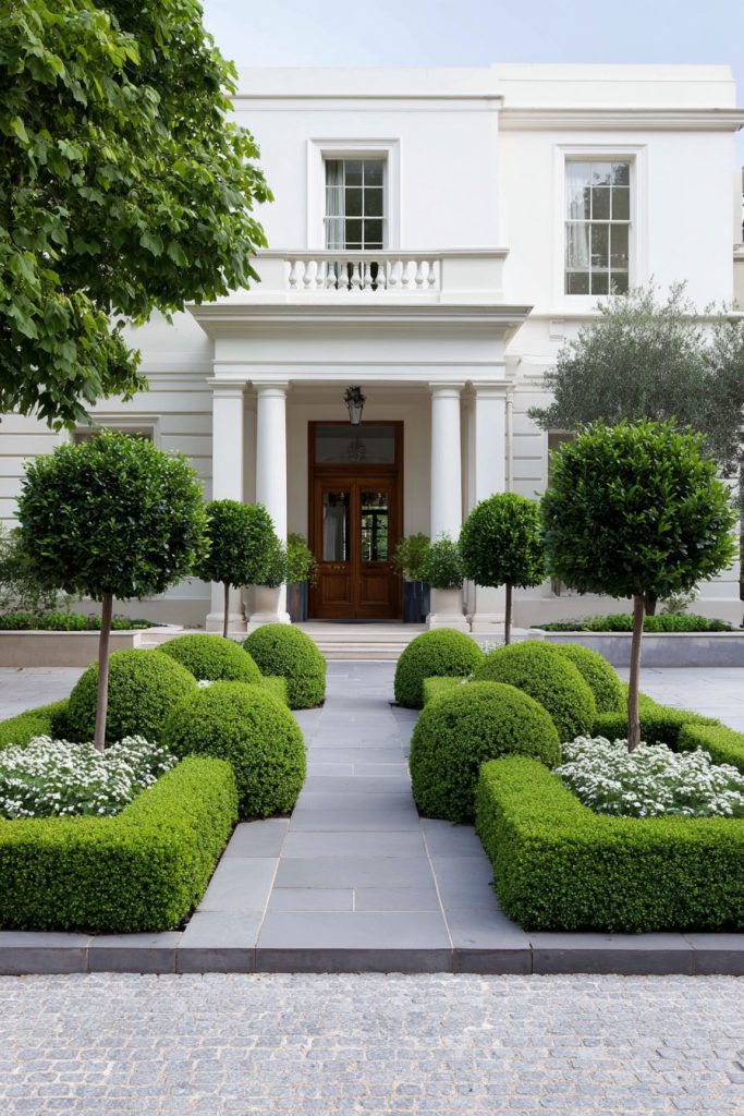 You can create a timeless front garden by using symmetrical boxwood hedges. These shrubs are easy to shape and keep neat with regular pruning.