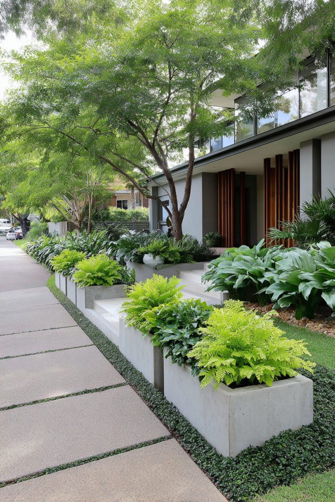 You can add a sleek touch to your front garden with modern concrete planters. They come in simple shapes and neutral colors that fit many styles.