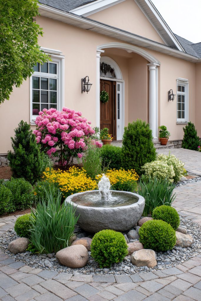 Adding a small fountain to your front garden brings a calm and relaxing vibe. The gentle sound of flowing water can make your outdoor space feel peaceful.