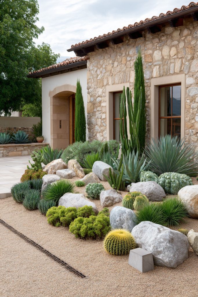 You can create a beautiful, low-maintenance front garden with succulents and cacti. These plants need little water and do well in dry, sunny spots. Adding rocks helps keep the soil stable and adds a natural look to your garden.