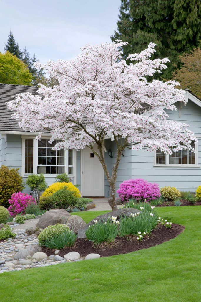 You can add bright spring color to your front garden with a flowering dogwood tree. Its delicate white or pink blooms create a fresh, cheerful look.