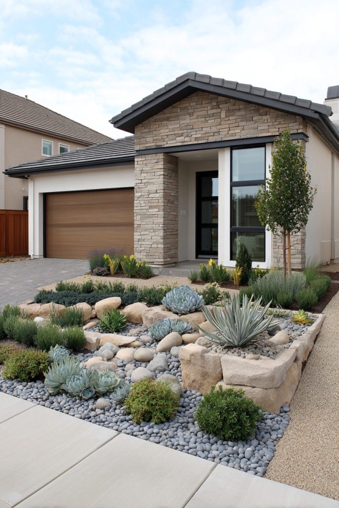 Mix different shapes and sizes of plants and rocks for a nice contrast. This garden style saves water and stays neat with little effort.
