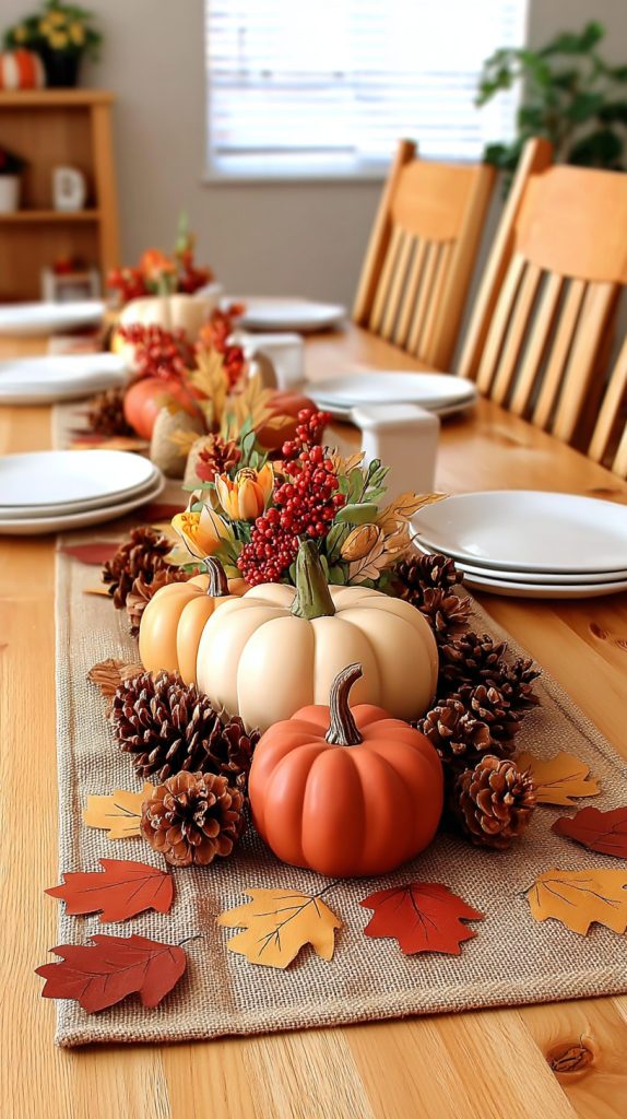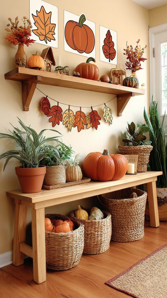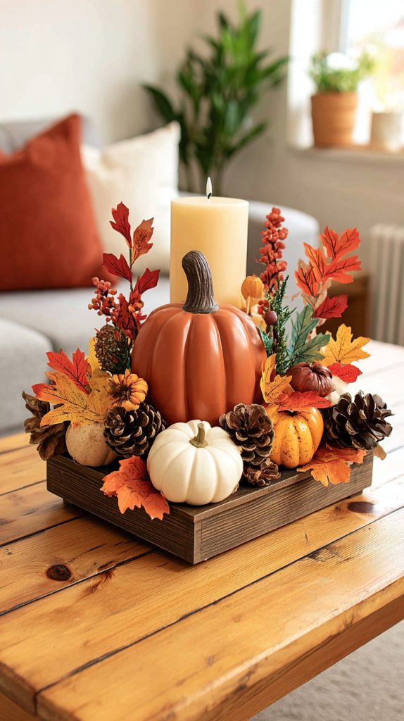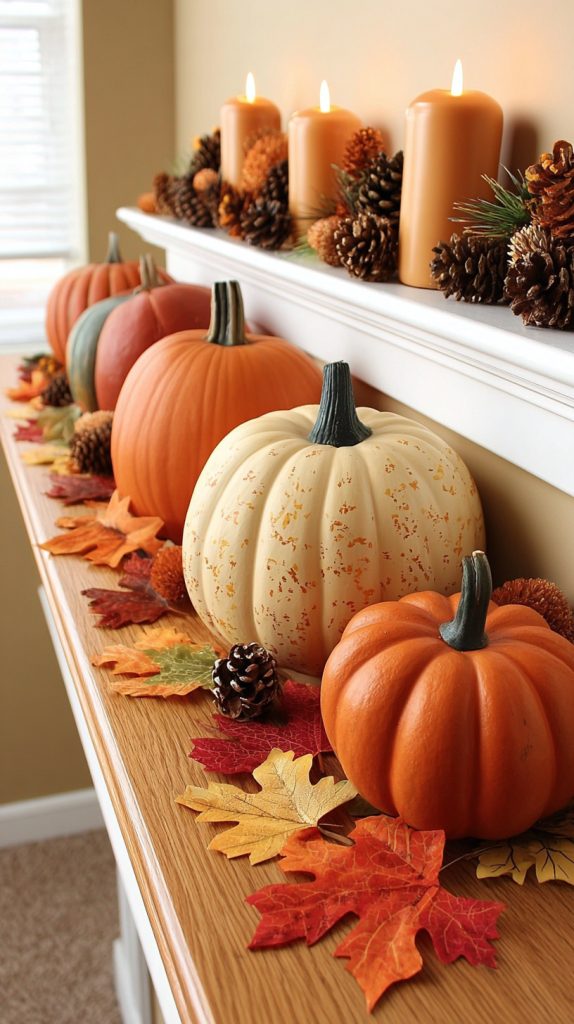 Add candles and fall leaves around the pumpkins for extra coziness. These simple touches bring that autumn feeling right into your home.