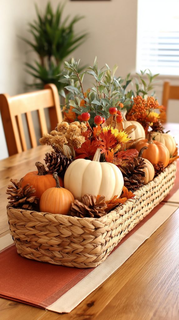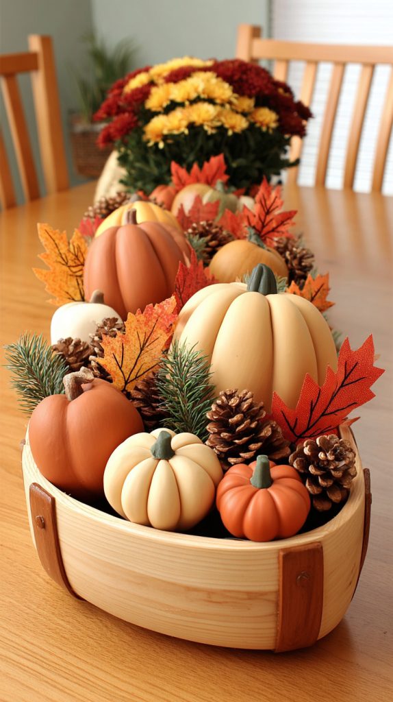You can add a warm, rustic touch to your fall decor with a wooden cornucopia centerpiece. Fill it with small pumpkins, pine cones, and colorful leaves.
