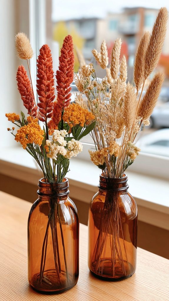 You can add warm colors to your home with dried flowers in amber vases. The amber glass gives a cozy, fall look that works well with earthy tones.