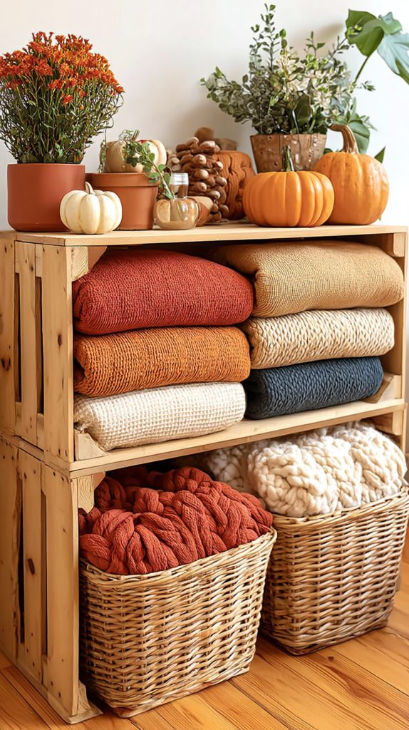 Place crates as side tables or display spots for seasonal items. You can also stack them for shelves or keep cozy blankets inside. Wooden crates bring warm, rustic vibes to your space with little effort.