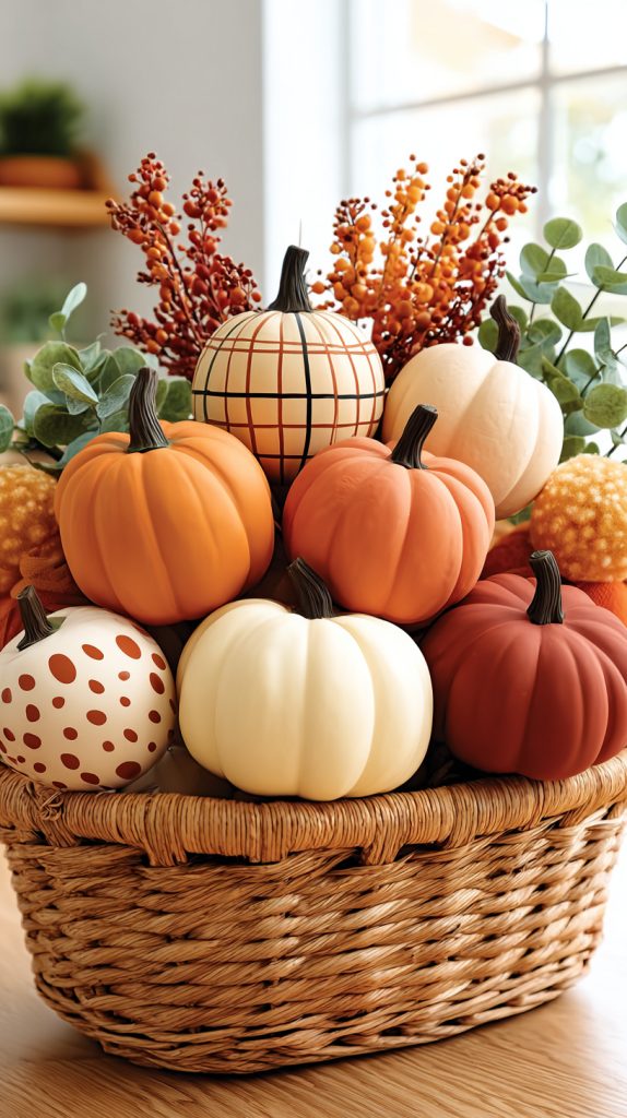 You can use mini faux pumpkins to add a cozy fall look to your tabletops. They come in different colors and patterns, like plaid or polka dots, which can match your style.