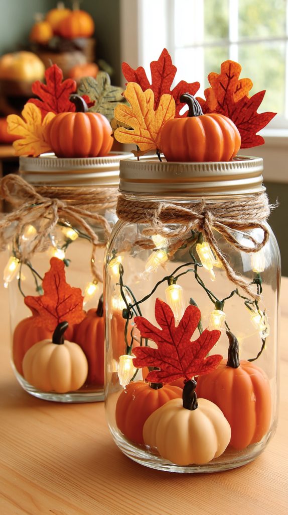 Add autumn touches like tiny leaves or mini pumpkins around the jar for extra fall charm. These lights work great as table decorations or soft night lights.