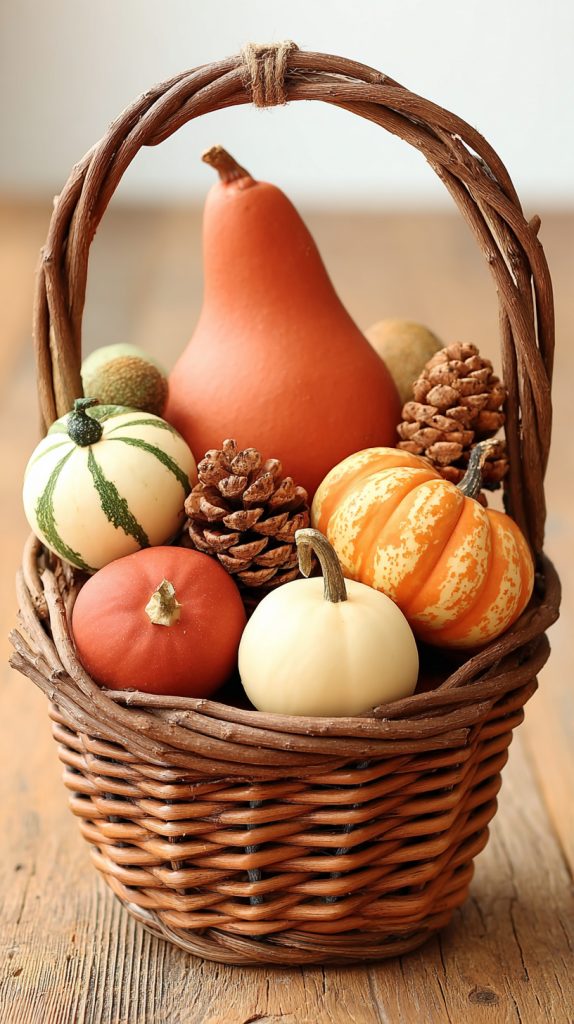 You can create a simple and charming look with rustic twig baskets filled with gourds. The natural texture of twigs pairs well with the shapes and colors of gourds.