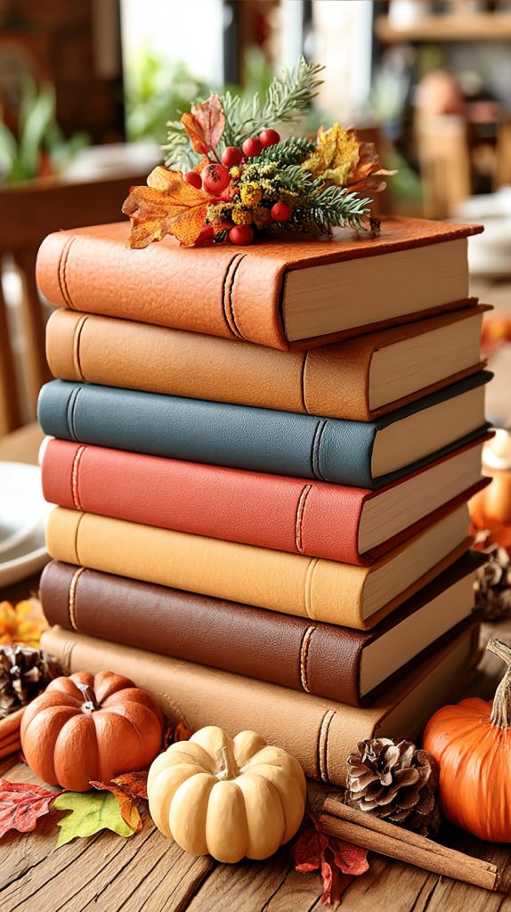You can use leather-bound books to add a warm, classic feel to your fall decor. Pick books with brown, orange, or deep red covers to match autumn colors.