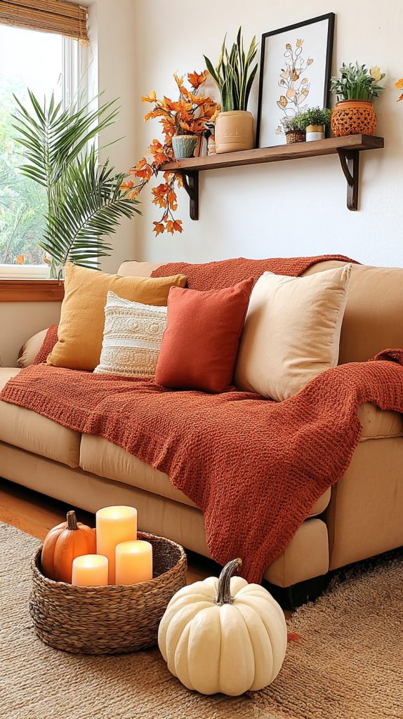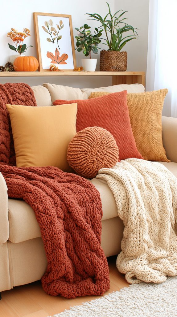You can add a cozy touch to your space by using warm-toned knitted throw blankets. Colors like rust, caramel, and oatmeal bring a soft autumn feel.