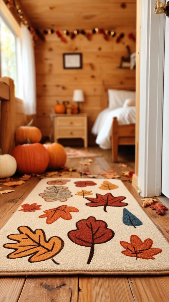 You can add a warm touch to any room with an autumn leaf patterned rug. These rugs bring in cozy colors like orange, brown, and gold.