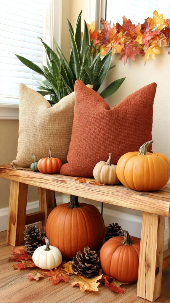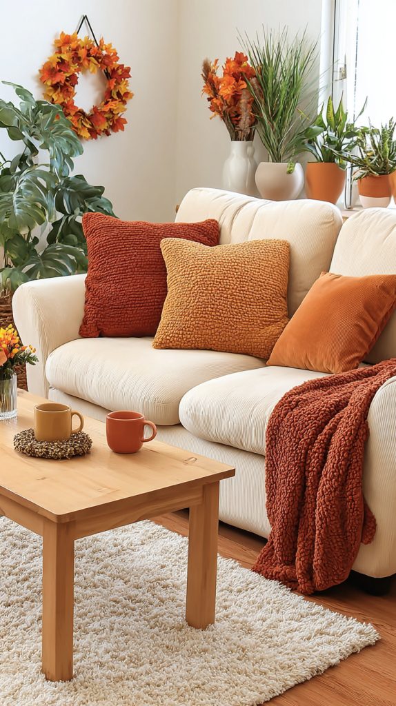 You can add warmth to your space with velvet pillows in orange and burgundy. These colors bring a cozy fall feel that works well on sofas or chairs.