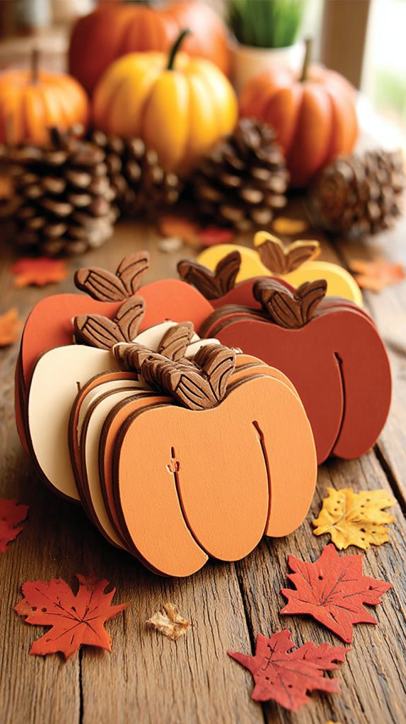You can add a cozy, rustic touch to your fall decor with wooden pumpkin coasters. These simple crafts show the natural beauty of wood grain and make a great seasonal accent.