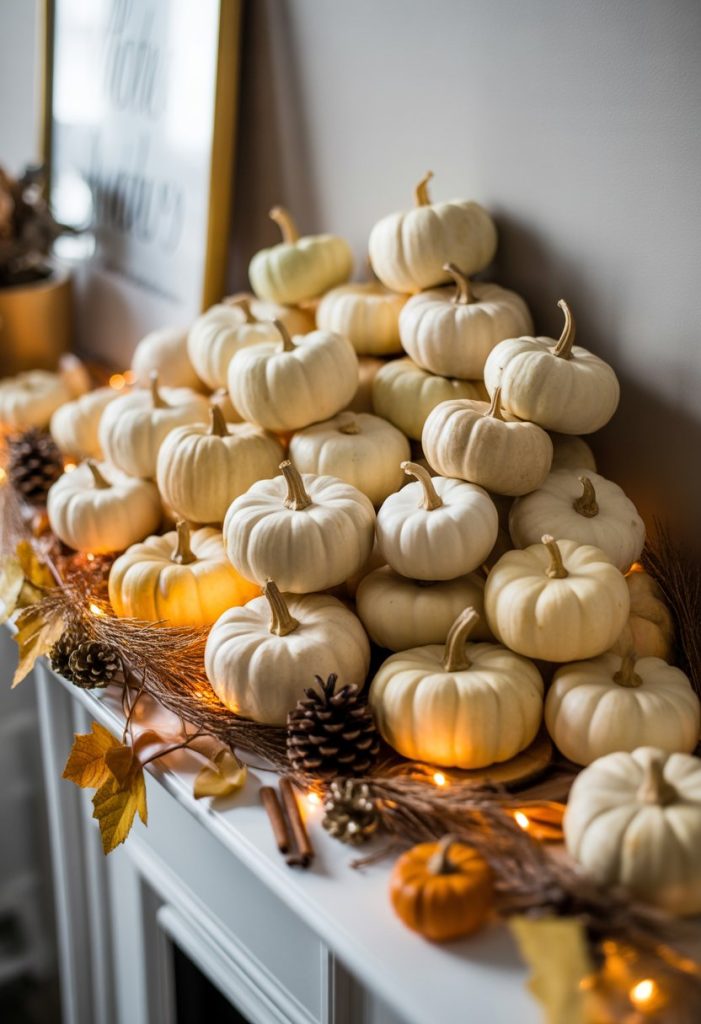 You can create a charming look by grouping small white pumpkins together on your mantle. Mix different sizes to add depth and interest.
