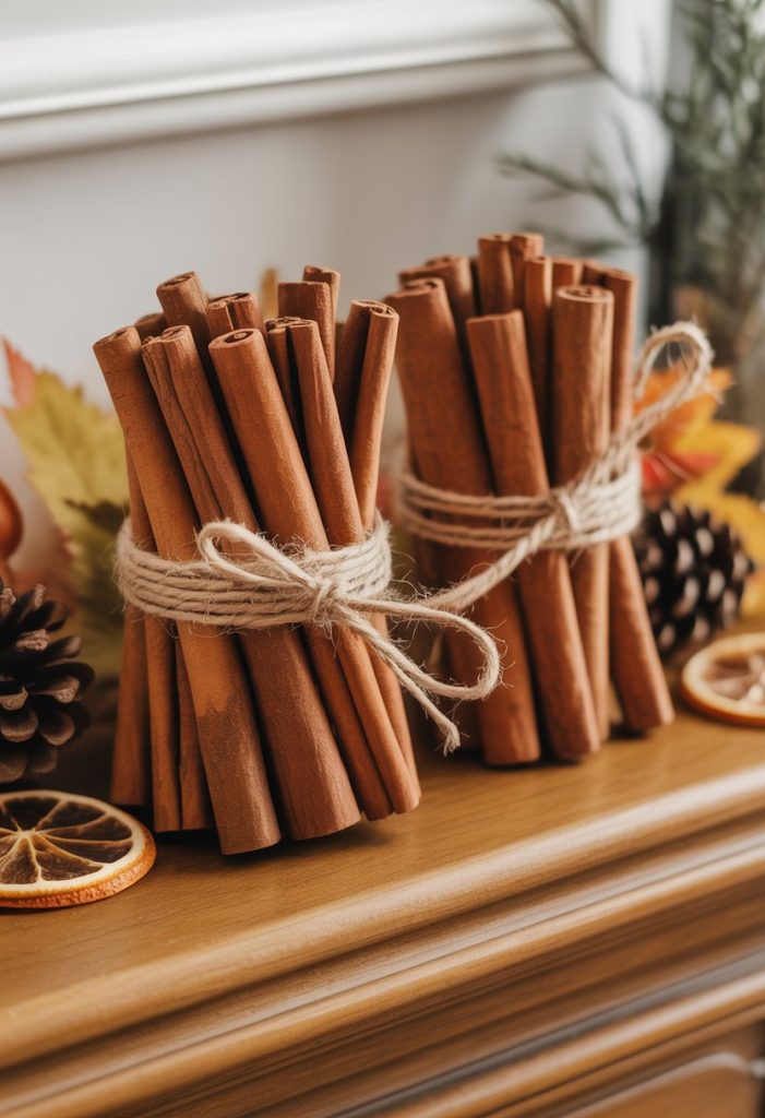 You can create simple cinnamon stick bundles by tying a few sticks together with twine. These bundles add a warm, rustic look to your mantle.