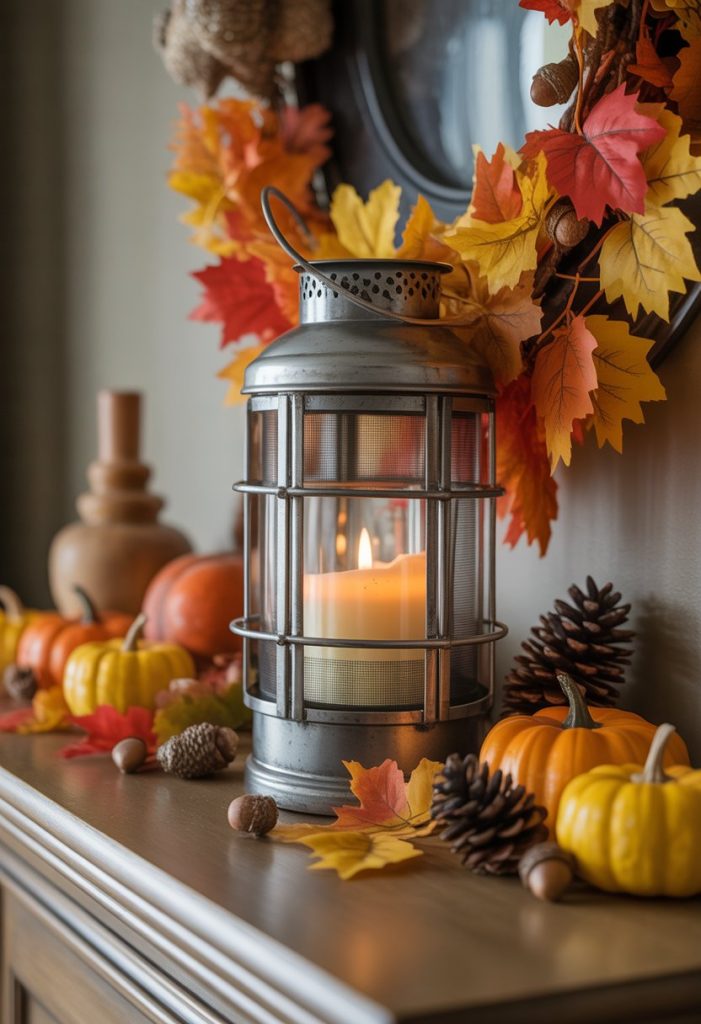 You can add a metal lantern to your mantel for a simple but cozy touch. Place a flameless candle inside to create a soft, warm glow without any fire risk.