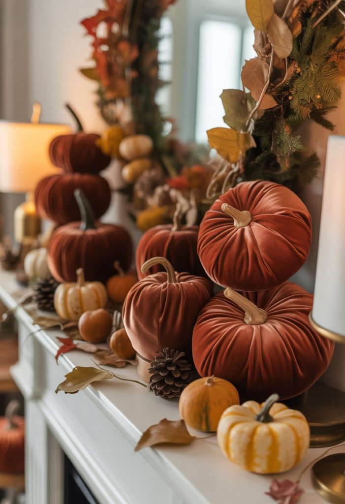 You can add a warm and soft touch to your mantle with rust-colored velvet pumpkins. Their rich, earthy tones fit well with fall’s cozy vibe.