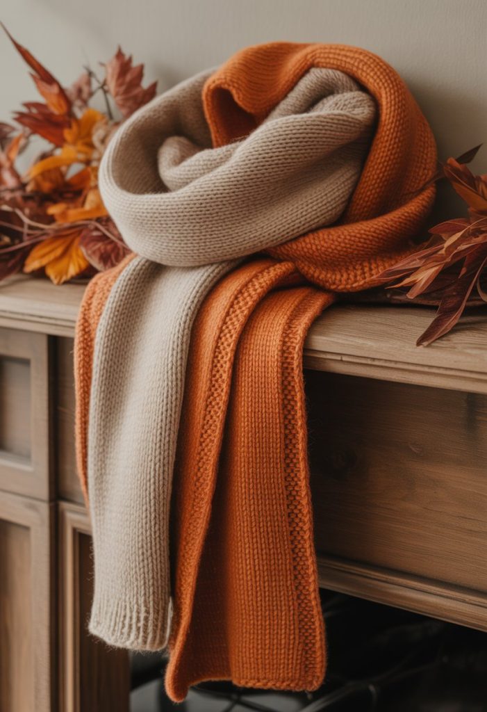 You can add warmth to your mantle by layering orange and beige knitted scarves. These colors bring a soft, cozy feel that fits fall perfectly.
