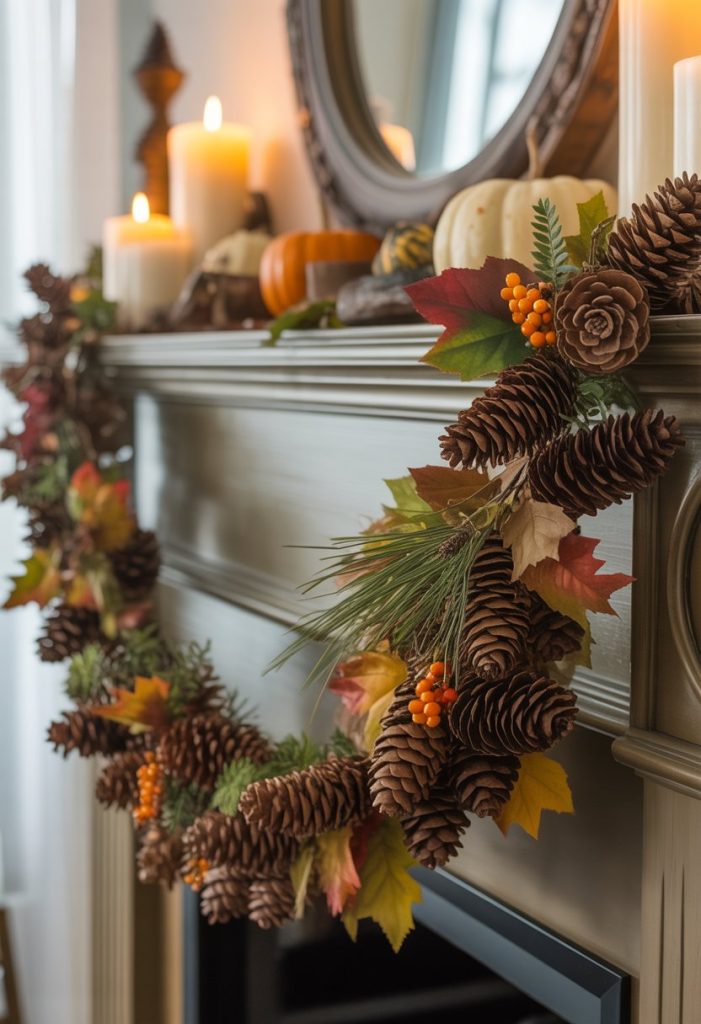 You can easily make a pinecone garland to add a warm, natural look to your mantle. Pinecones bring a rustic touch and work well with other fall decorations like leaves or pumpkins.