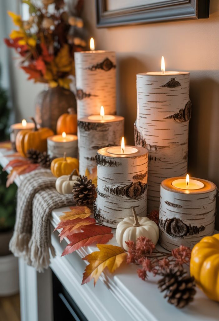 You can add a cozy feel to your mantle with faux birch log candle holders. They look natural but are easy to move and clean.