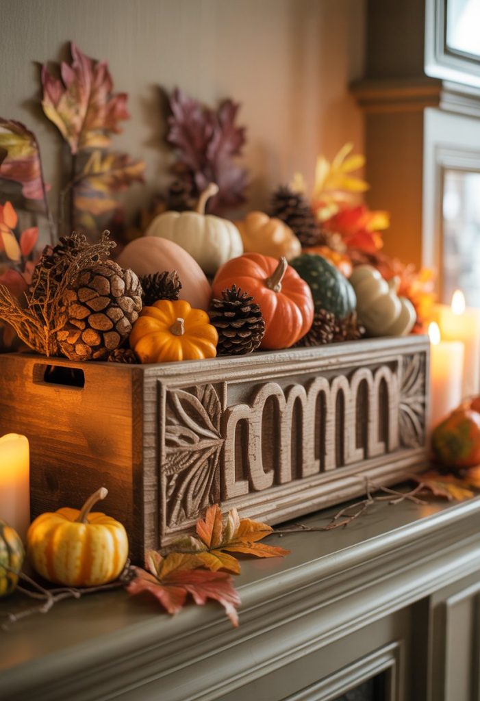 Fill the crates with small pumpkins, pine cones, or candles. This adds texture and makes your fall display feel cozy and warm.