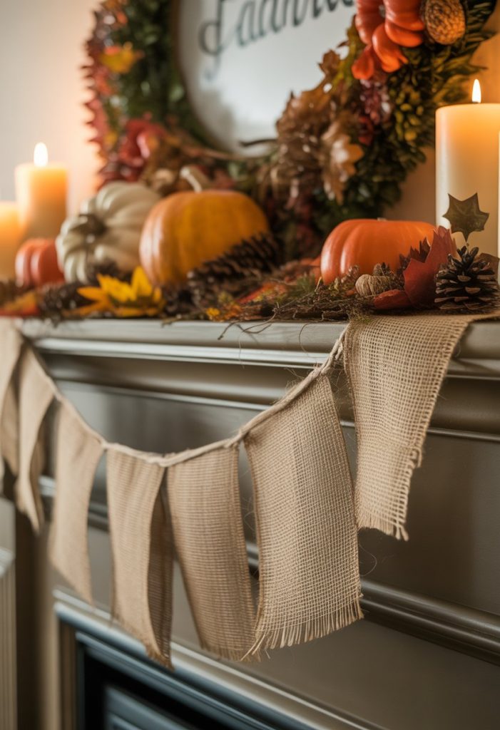 You can add a rustic burlap banner to your mantle for a simple, cozy look. The burlap texture brings warmth and fits well with fall themes like pumpkins and leaves.