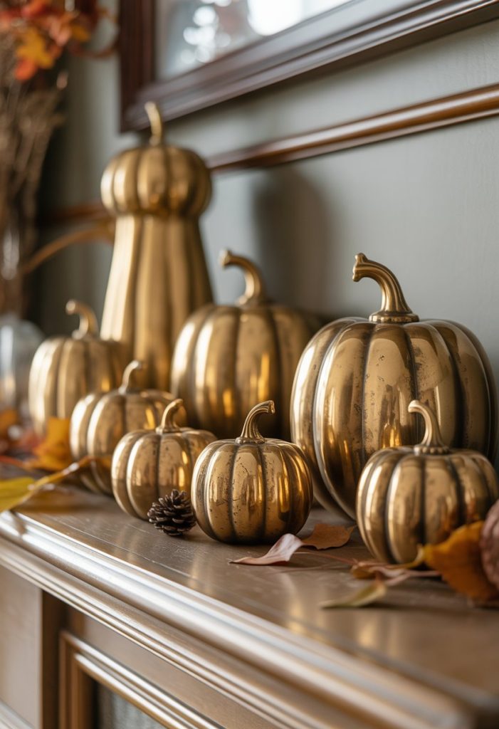 You can add a touch of warmth and charm with antique brass pumpkin figurines. These small decorations bring a vintage feel to your fall mantel.