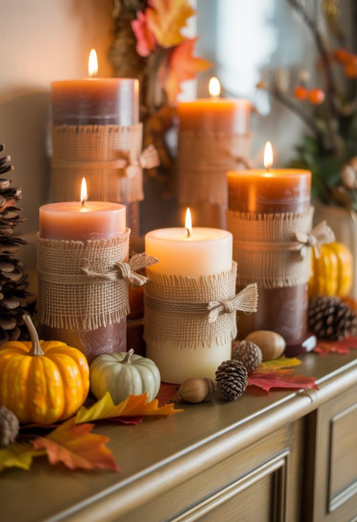 You can easily dress up your pillar candles by wrapping burlap ribbon around them. It adds a cozy, natural look that fits well with fall decor.