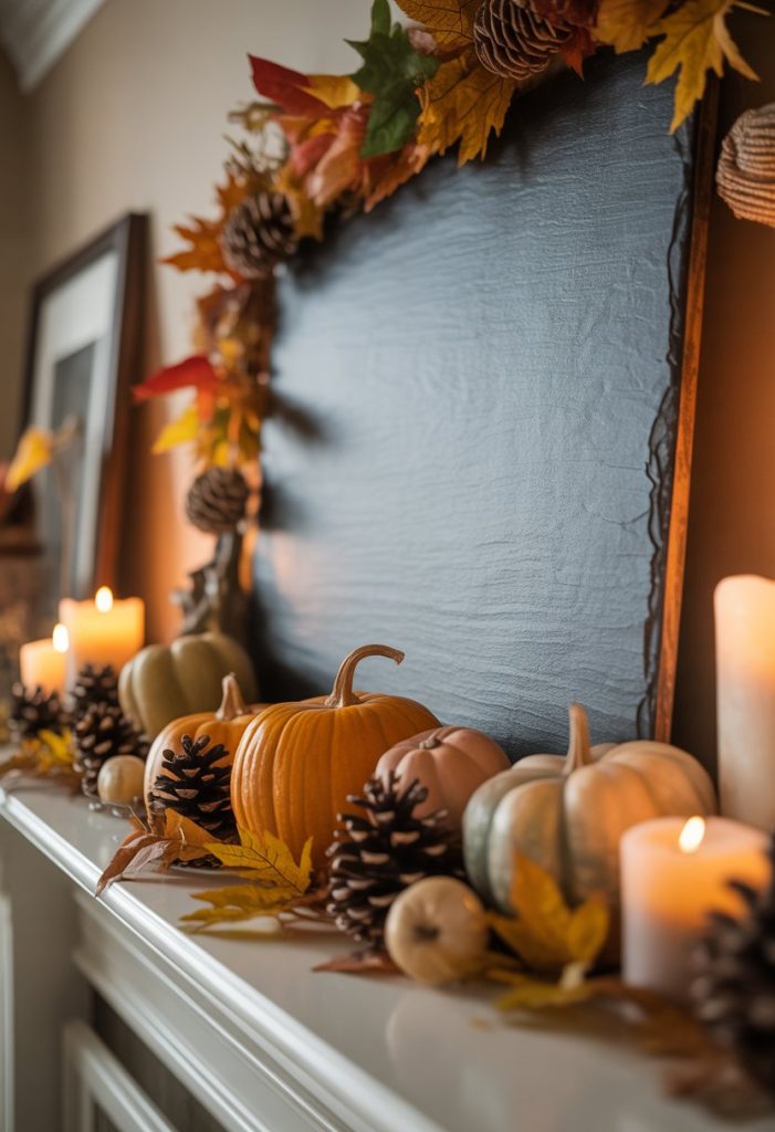 You can add a simple slate sign with “Hello Fall” lettering to your mantle for a clean, natural look. The dark slate background makes the white or warm-colored letters stand out nicely.