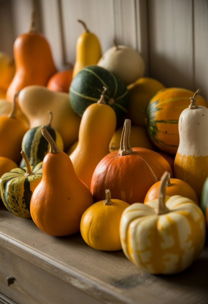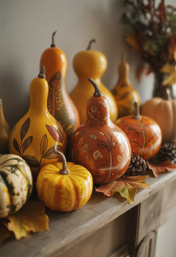 Add a few pumpkins or dried leaves around the gourds to make the cluster feel full and festive. This simple idea brings fall charm without much effort.