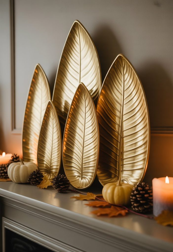 You can add a warm, elegant touch to your fall mantle with gold-toned leaf-shaped trays. They catch light beautifully and give your space a soft glow.