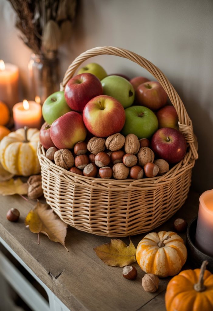 You can use a simple woven basket to add a cozy, fall touch to your mantle. Fill it with fresh apples and a mix of nuts for a natural, harvest look.
