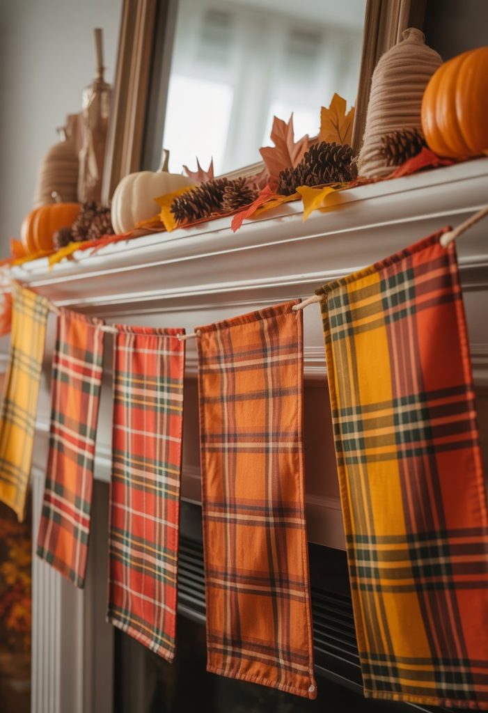 You can add a warm, cozy touch to your mantle with colorful plaid fabric banners. Choose autumn colors like red, orange, and brown to fit the season.