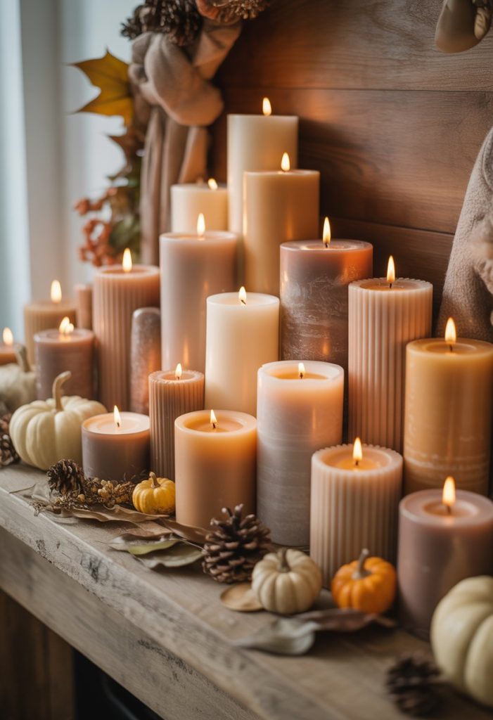 You can create a warm look by stacking neutral-tone candles on your mantel. Use different sizes for a simple, layered effect.