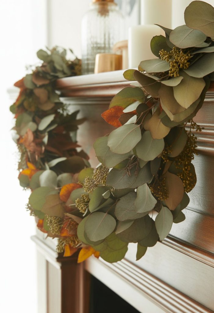 You can easily add a soft, natural look to your mantle with dried eucalyptus garland. Layer it with other greenery like cedar or pine for extra texture.