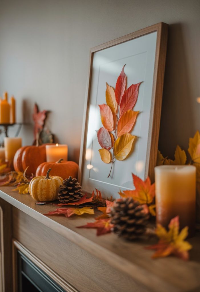 You can add a simple touch of fall by framing autumn leaves. Choose leaves with rich colors like red, orange, and yellow to brighten your mantel.