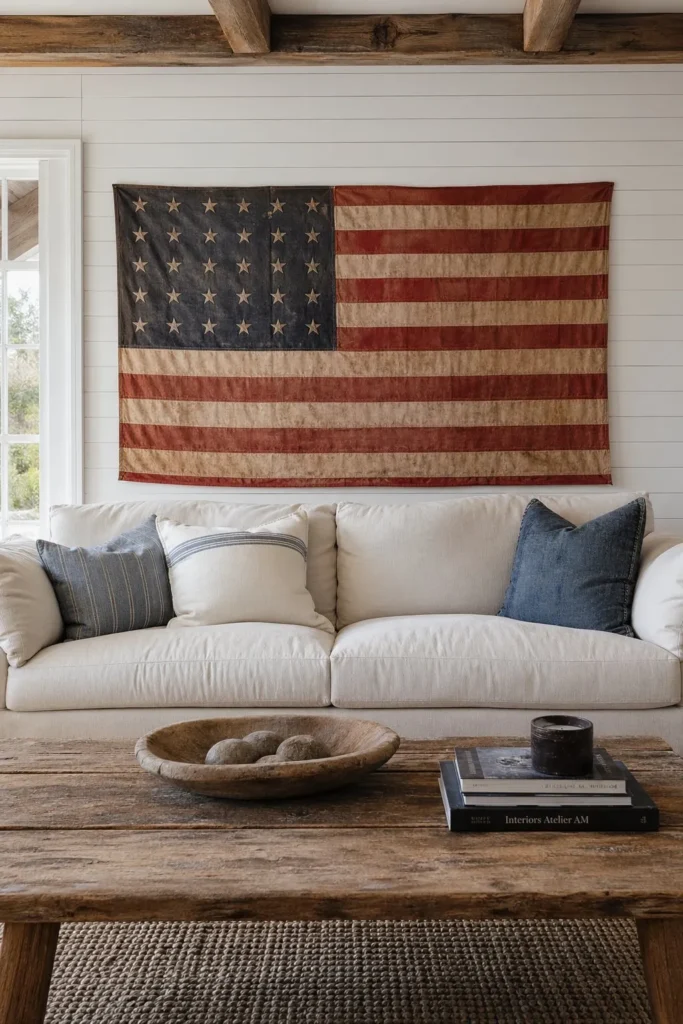 A bright new flag can overpower a neutral room, so soaking a cotton flag in black tea gives it that perfect aged, historical look. Pin it flat against a white shiplap wall to create an instant focal point for your rustic americana decor. The muted brick reds and navy blues blend beautifully with natural linen sofas and reclaimed wood coffee tables. This simple trick adds rich texture without messing up your everyday color palette.
