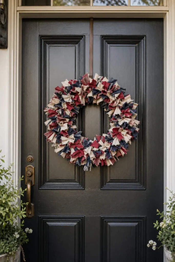 10. Hang a Rustic Patriotic Rag Wreath on the Front Door