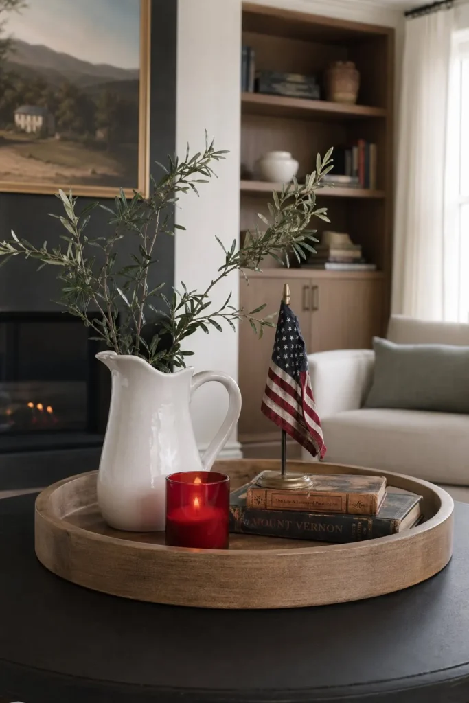 Corralling smaller items onto a single tray prevents your coffee table from looking cluttered. Start with a large, round wooden or galvanized metal tray as your base. Add a small white ironstone creamer, a bundle of sparklers tied with twine, and a chunky red pillar candle. This layered arrangement keeps your everyday surfaces tidy while celebrating the farmhouse patriotic decor style.
